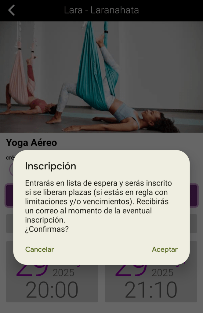 Abre la sesión como si fueras a inscribirte con normalidad y te aparecerá el mensaje que se te añadirá en la lista de espera y te aparecerá la clase en color naranja en el listado. En esta app, si estás la primera en la lista de espera y alguien cancela se te apuntará directamente y te enviarán una notificación por correo electrónico. En caso de que no quieras asistir, entra para cancelar o bien la lista de espera o bien la clase para no perder tu bono, como te explicaba anteriormente.