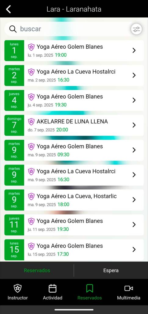 Con esto ya tendríamos la clase reservada, verás que en el listado general te aparecerá una bolita en verde en vez de lila, eso significa que es tu clase reservada. También abajo, donde dice «Reservados» te aparecerá un listado resumen de todas las clases que tienes reservadas.